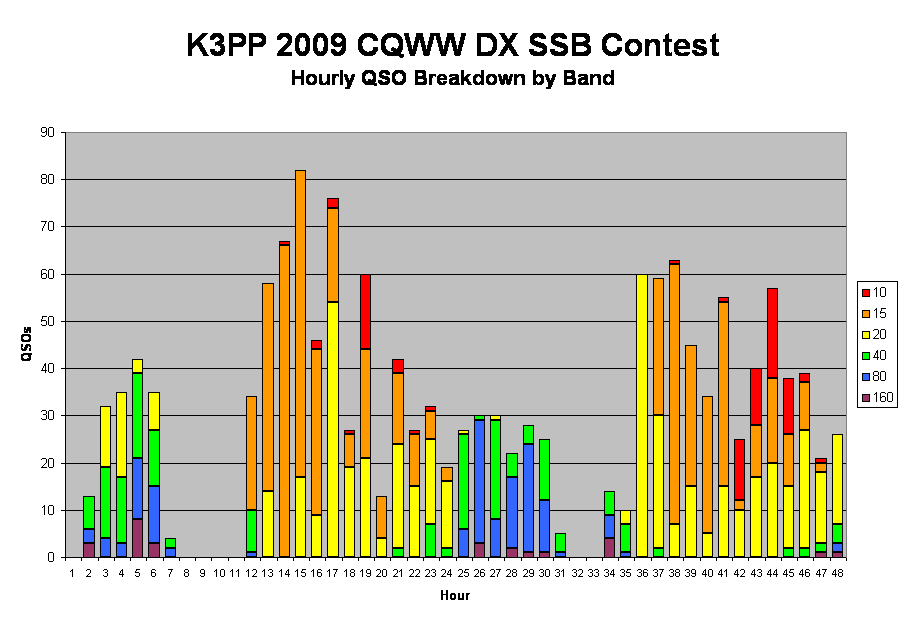 The graph below shows my hourly rates broken down by band. The yellow bars indicate 20m, so you can easily see how 20m dominated this contest.