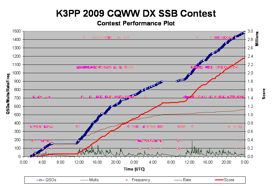The chart below is my Performance Plot for the contest. I developed this plot in Microsoft Excel several years as a graphical aid in analyzing contest performances.