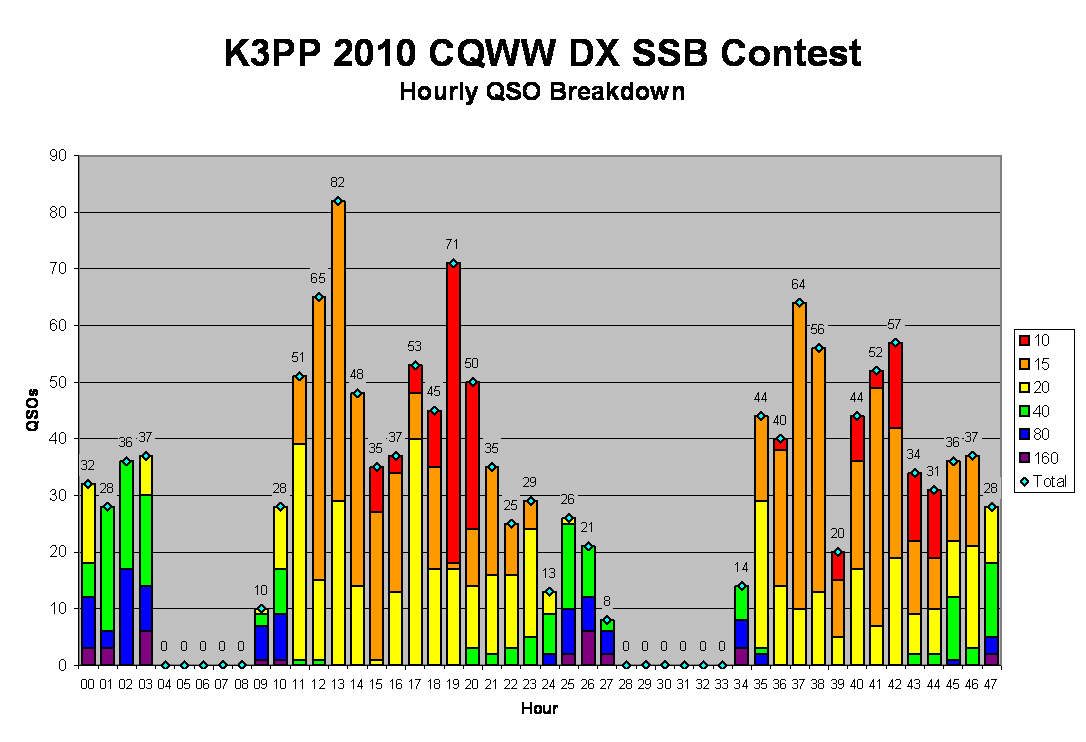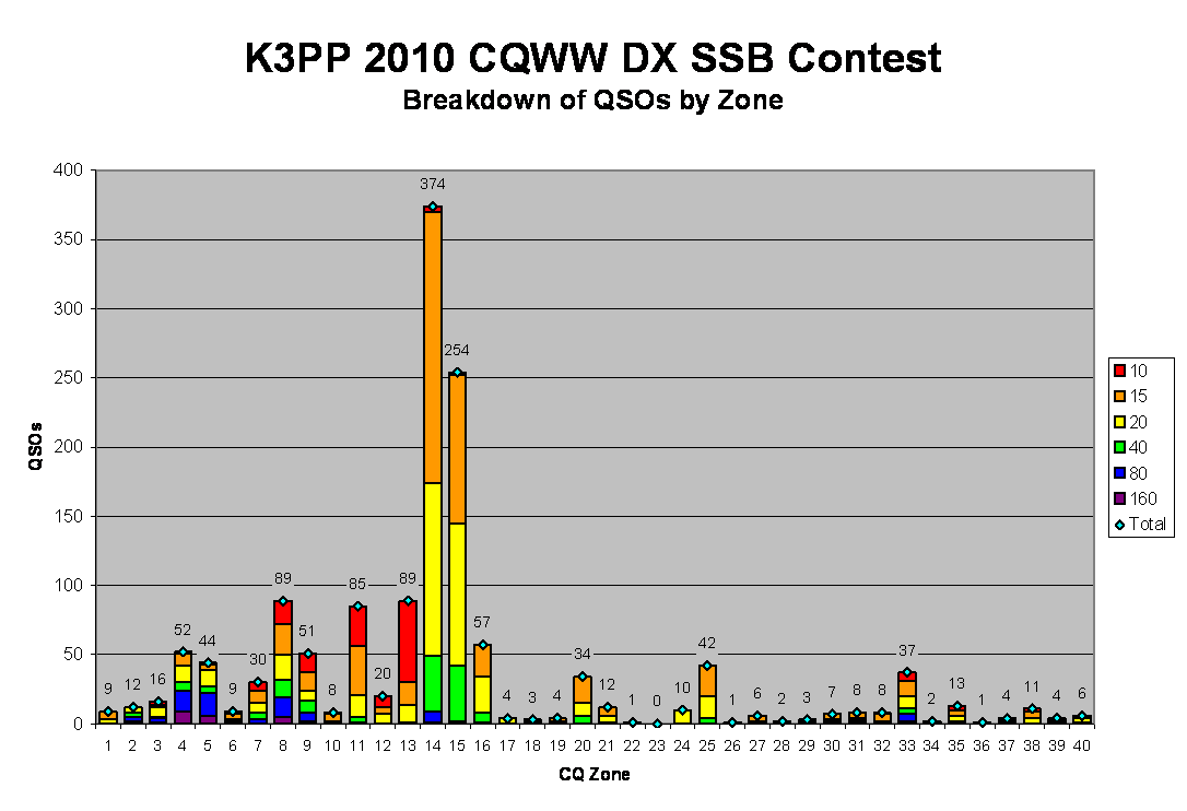 There were few surprises in the zone breakdown. As usual, zones 14 and 15 dominated, with strong showings from zones 8, 11, and 13. IÂ was thrilled to snag VU2PAI on 15m for zone 22 and ST2AR made the usually elusive zone 34 relatively easy. I heard JT5DX coming in loudly on 40m, but IÂ couldn't break through the cluster mob, making zone 23 my only missed zone.