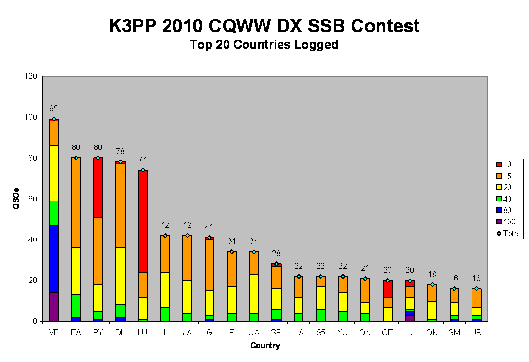 I usually log more Germans than any other country. This time, they came in fourth place! The Italians are usually #2 and here they were only #6! The distribution in this contest tells me three notable things: